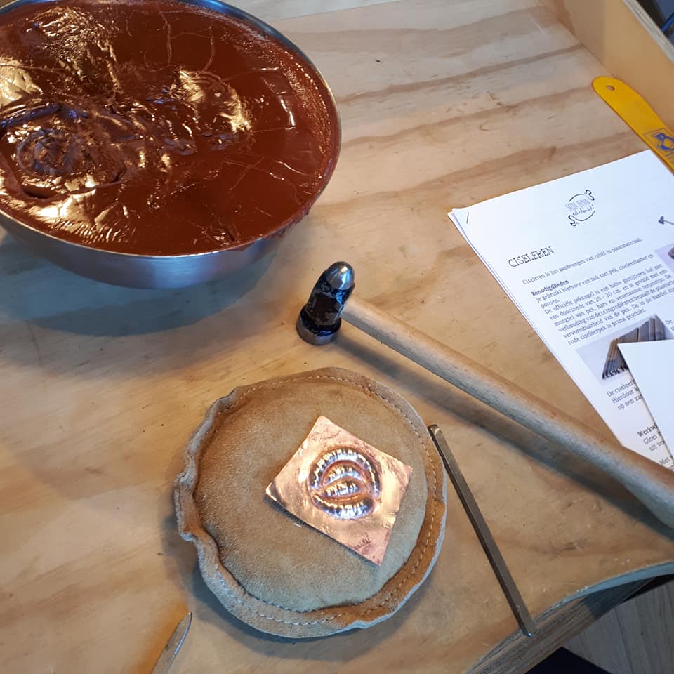 Mocht u de smaak te pakken hebben en thuis verder willen gaan: pekpannetjes en ciseleerhamers zijn in het atelier te koop.